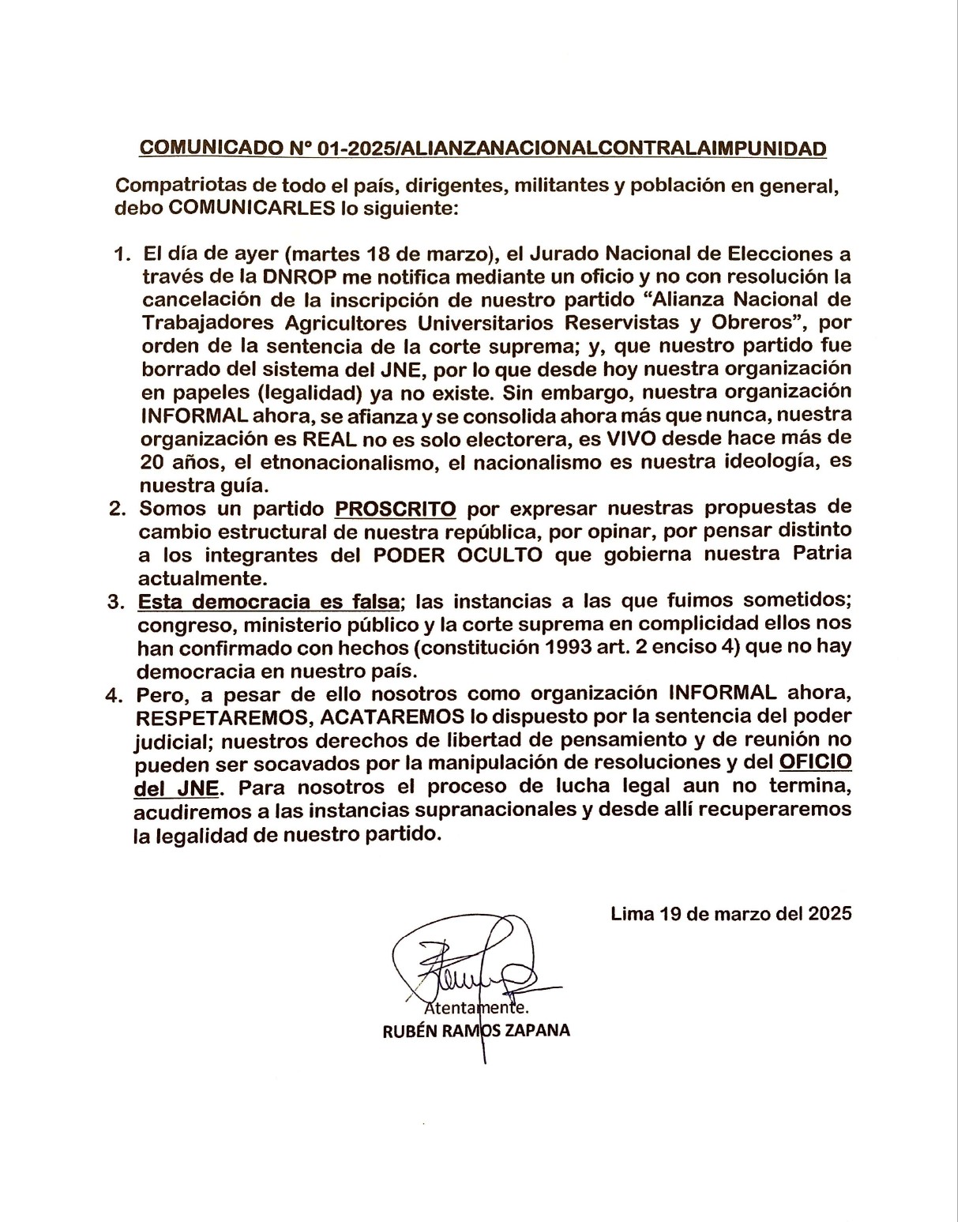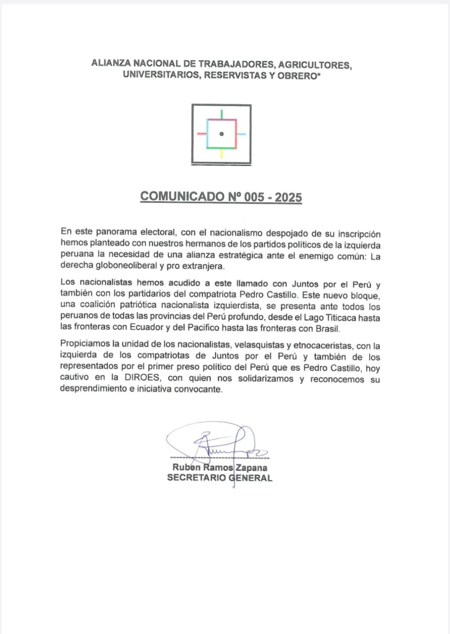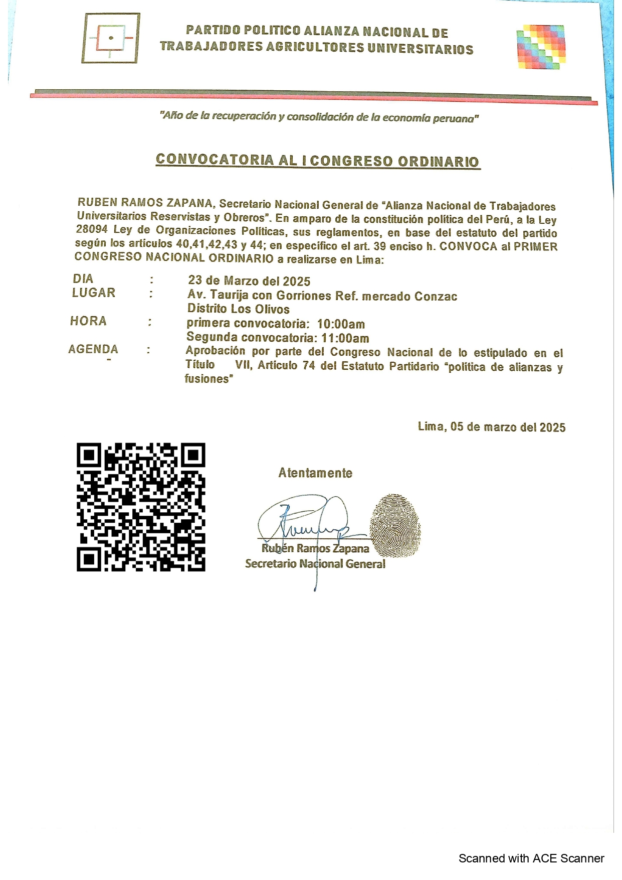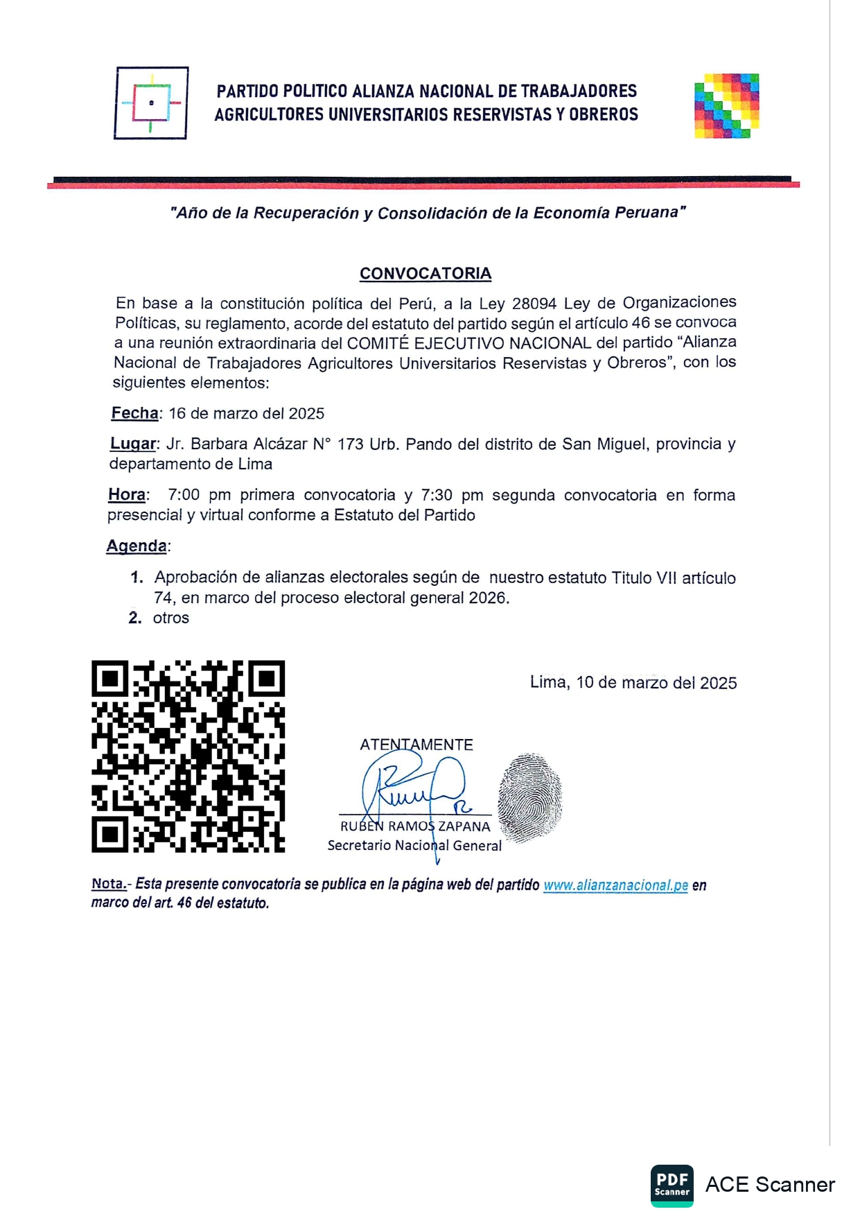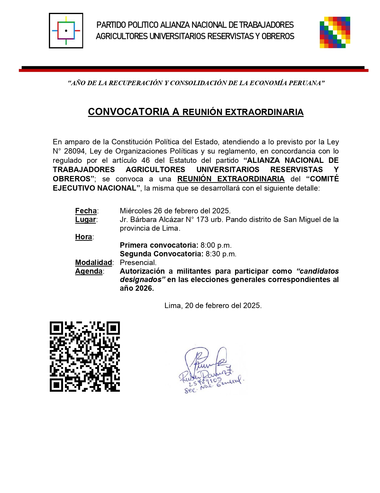 La dirección nacional de registros de organizaciones políticas del Jurado Nacional de Elecciones, pone en conocimiento la inscripción de la organización política Alianza Nacional de Trabajadores Agricultores Universitarios Reservistas y Obreros.
